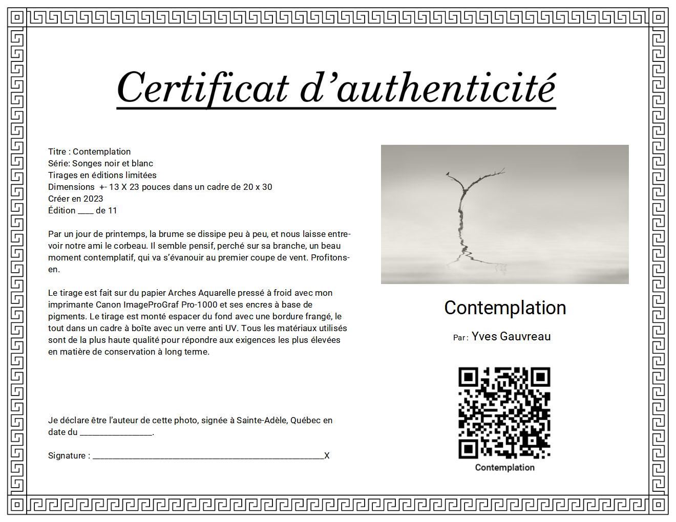 Voici le certificat d'authenticité pour ma photo "Contemplation".